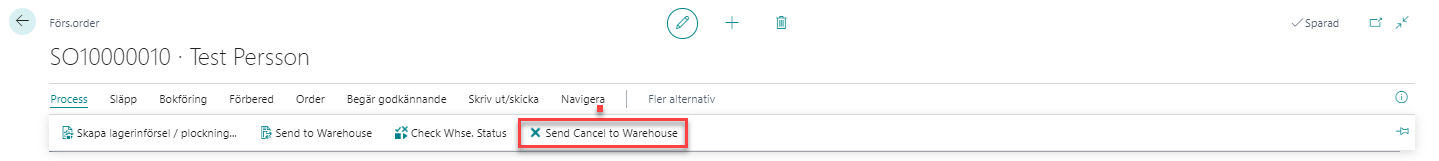 Om WMS stödjer makulering av order så stoppar det uppdraget. Makulera genom att välja Send Cancel to warehouse.