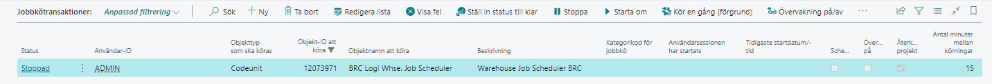Kontrollera i Jobbkötransaktioner att BRC Logi Whse. Job Scheduler har status Klar.