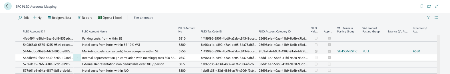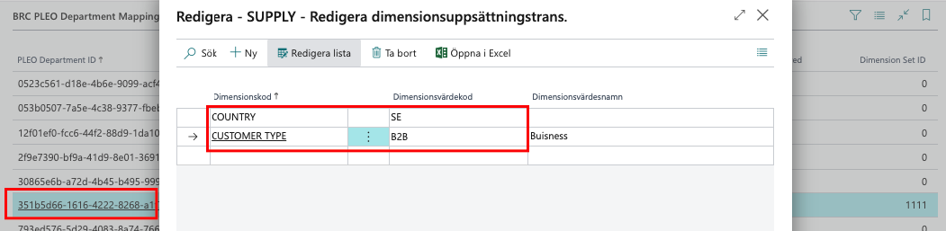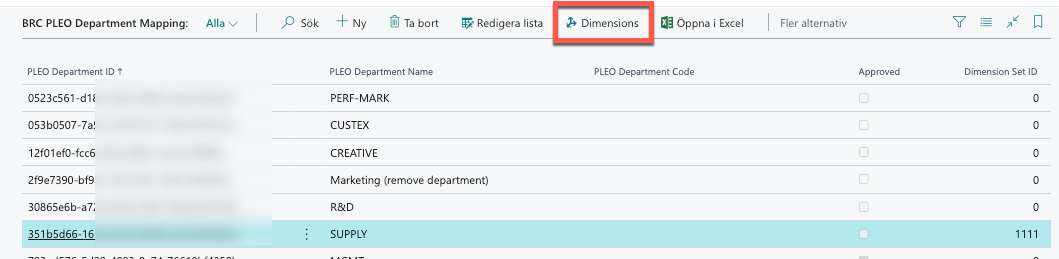 I BRC PLEO Department Mapping fylls det på med nya värden från Import PLEO departments som finns i BRC PLEO Setup.