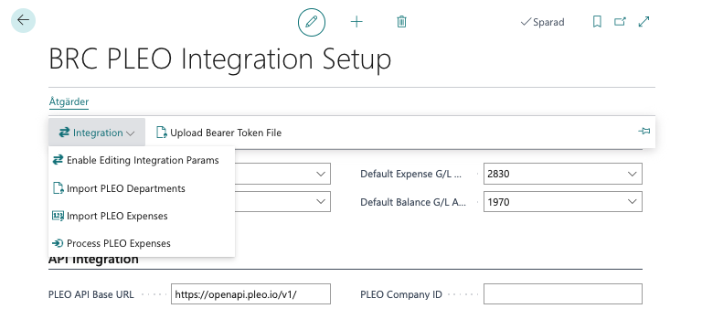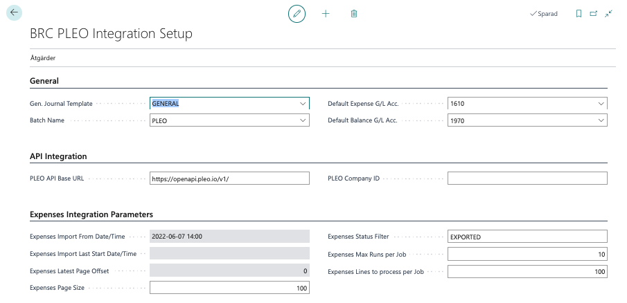 I Gen. Journal Template och Batch Name anges den redovisningsjournal som ska få transaktionerna från Pleo Default Expense G/L acc. anges standardkontot för utgifter Default Balance G/L acc. anges standardkontot för betalningar PLEO API Base URL adressen för Pleo (samma för alla) Expenses Integration ParametersExpenses Import From Date/Time kan ändras om behöver importera in från annat datum. Vid ändring välj Åtgärder - Enable Editing Integration Params först Expenses Status Filter sätter filter om bara önskar ta in transaktioner med viss status såsom de med status EXPORTED från Pleo. Önskas flera värden så sätt komma emellan Expenses Lines to process per Job antalet transaktioner som behandlas vid tillfället som jobbkön körs