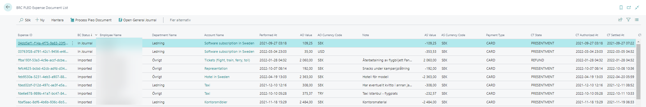 Jobbköerna Get Pleo Employees/Accounts fyller på med data och Get Pleo Expenses tar in transaktionerna till BRC PLEO Expense List med status Imported. Process PLEO Documents är andra steget som lägger in utläggen i redovisningsjournalen.
