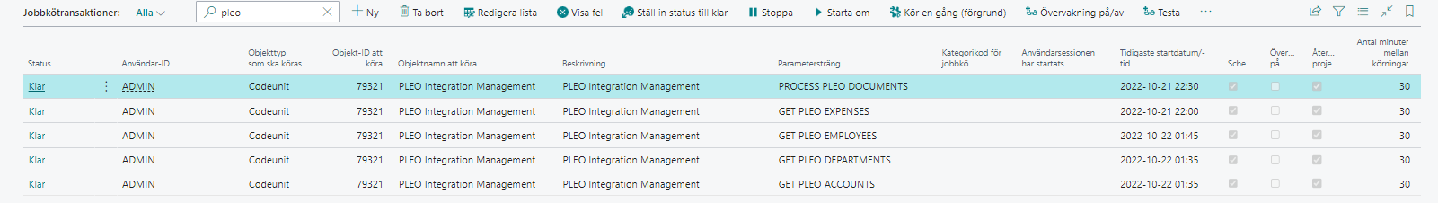 Sök på Jobbkötransaktioner och i sökrutan för listan skriv “pleo”. Jobbköerna har satts upp med automatik men behöver startas genom att välja Ställ in status till klar. Jobbköerna går men 30 minuters mellanrum.