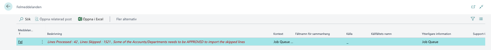 Process PLEO Documents är andra steget som lägger in utläggen i redovisningsjournalen . Om någon jobbkö felar, markera rad, gå in i felmeddelande ( Åtgärder - Jobbkö - Visa fel) för att se vad som saknas t ex inställning eller godkännande.