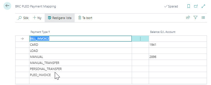 I BRC PLEO Payment Mapping ange konto för de betalsätt som ni valt att använda i Pleo.