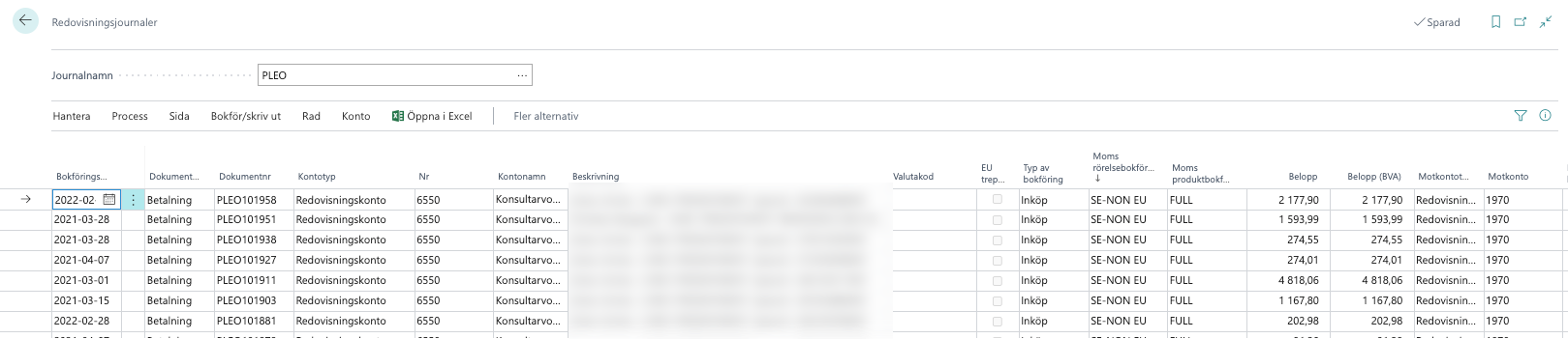 Sök Redovisningsjournal och välj Journalnamn: exempelvis "Pleo". Här ser du de transaktioner som har status In Journal. De blir klassade som Inköp. De får kontonummer, momsmallar enligt mappning för konton, Motkonto enligt Payment Type samt dimensioner enligt Department.