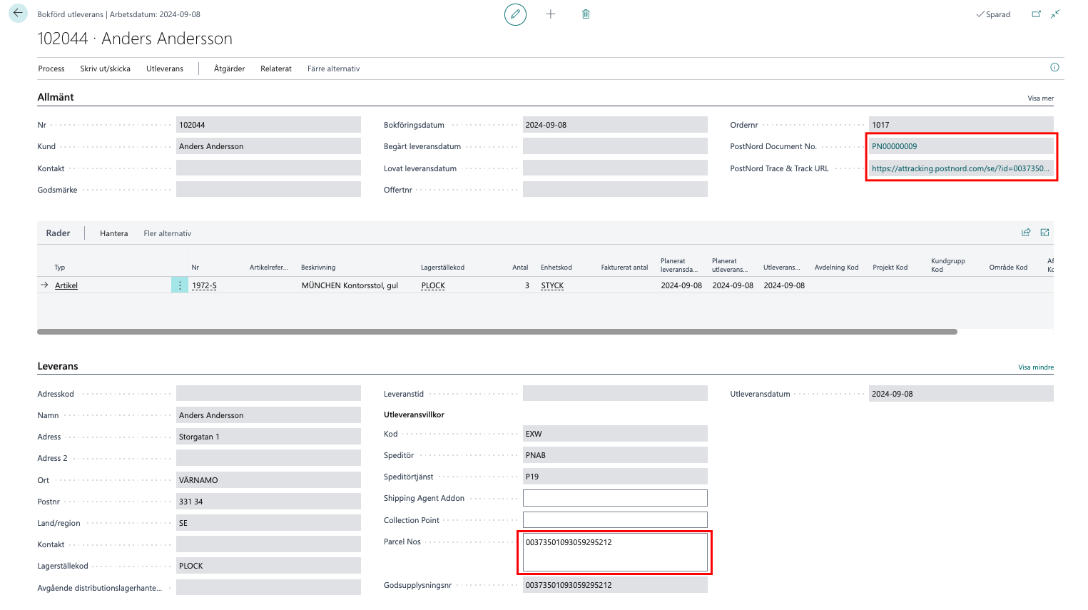 Försäljningsorder uppdateras med PostNord Document No.