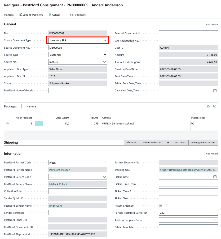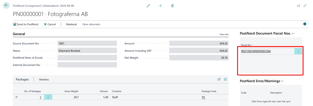 Sök upp Consignment. PostNord Document Parcel No. finns för att spåra paketet. Parcel Number läggs också till i dokumentet Bokförda förs.utleveranser i Business Central. Statusen är satt till Shipment-booked vilket betyder att försändelsen har registrerats i PostNord.