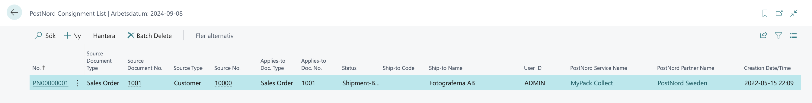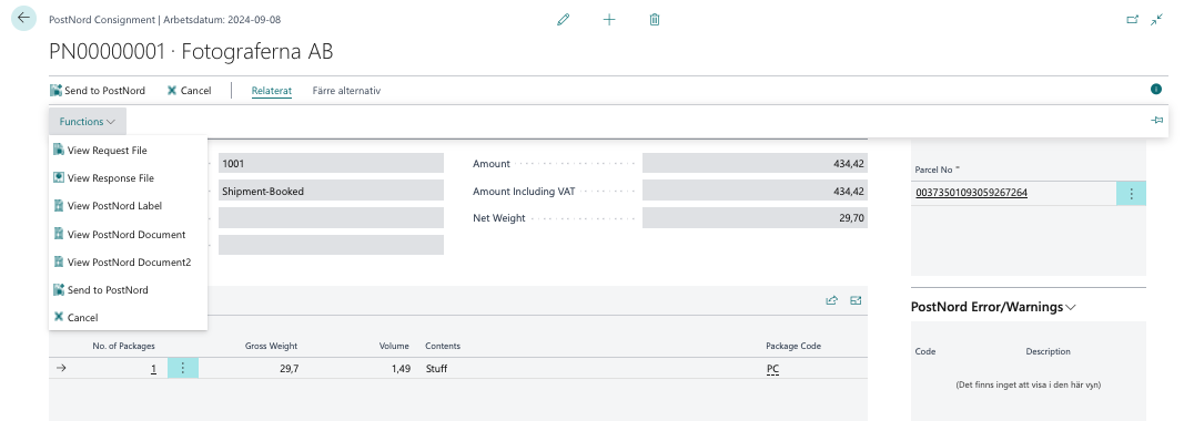 Du kan också gå in på en Förs.order och klicka på PostNord Document No för att öppna Consignment.