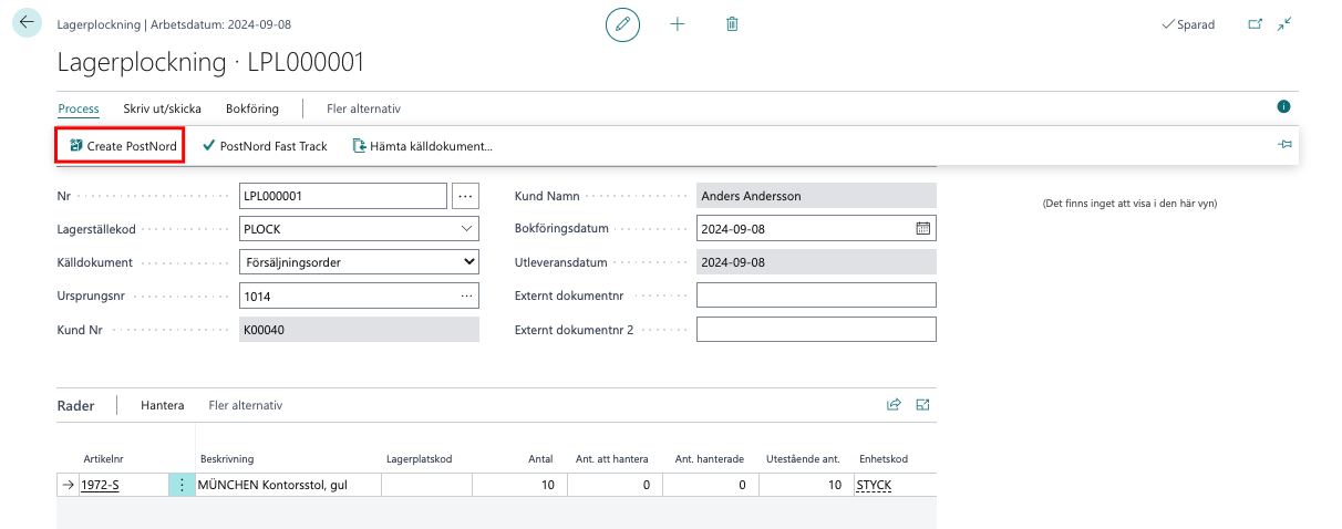 Eller i lagerplock klicka på Create PostNordför att skapa PostNord dokumentet.