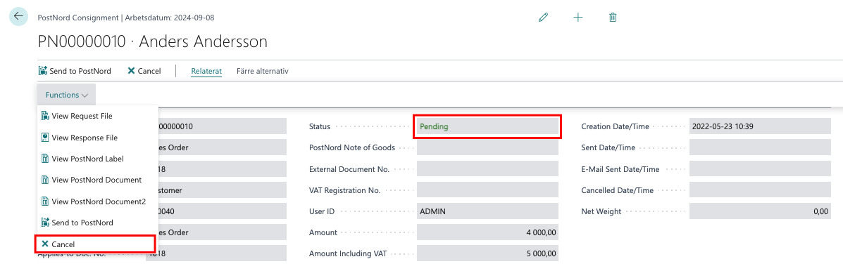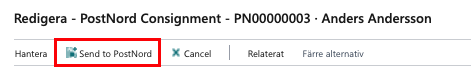 Sök upp Consignment. Klicka på Relaterat, Functions, Send to PostNord