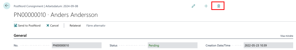 Sök upp Consignment. Klicka på “papperskorg” (det går att makulera sändning så länge den är i status Pending).