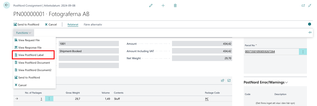 Sök upp Consignment. Klicka på Relaterat, Functions, View PostNord Label