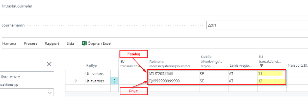 Saknar raderna EU transaktionstyp värden så beror det på att det saknades Intrastatinställningar när ordern skapades. Kontrollera att inställningar finns för framtida transaktioner. Rätta transaktioner som saknar värde genom fylla i värde manuellt.