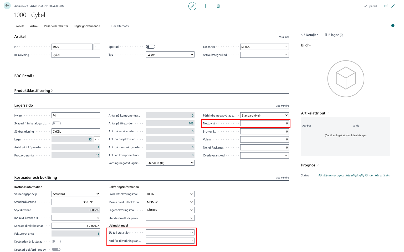 Saknar raderna EU tull statistiknummer, Nettovikt och/eller Kod för tillverkningsland så lägg in det på artikeln. Genväg till artikeln finns under Process – Artikel. Efter rättat artikel kan du ta bort rader (eller alla rader) och välja Process – Föreslå rader så hämtas raden in igen med uppdaterade värden från artikelkortet.