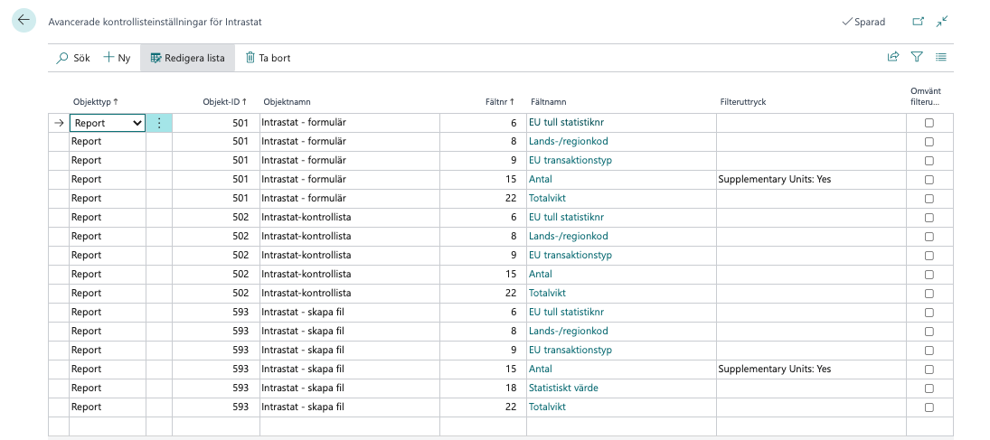 I Länder/Regioner väljs de länder som ska ingå i intrastatrapporteringen genom att ange ett värde motsvarande landskod i kolumn Intrastatkod.
