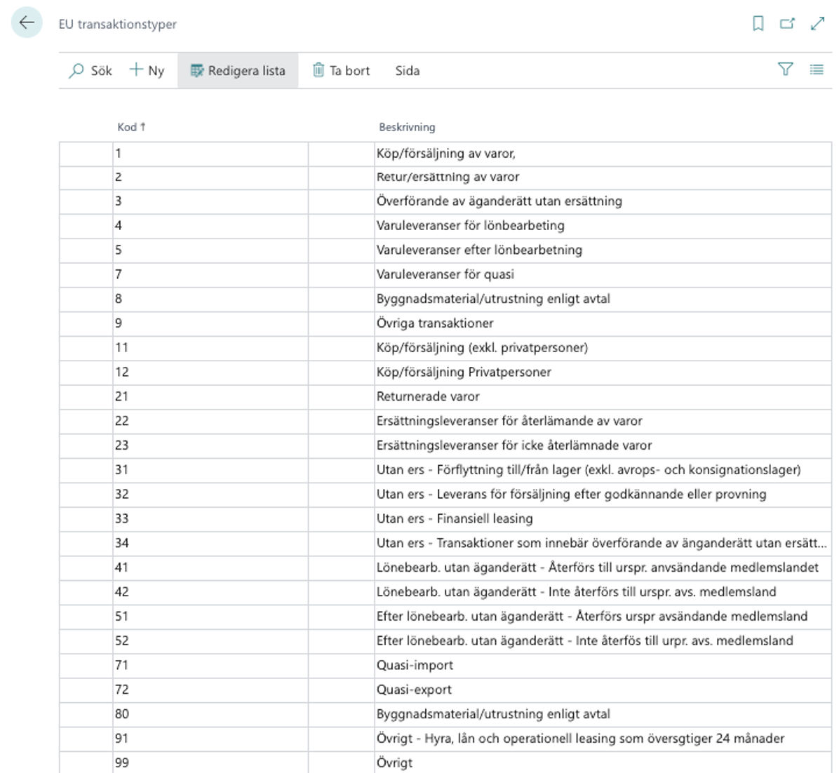 Sök EU transaktionstyper och lägg till de Transaktionstyper som behövs. Nedan ser du vårt förslag på register. Gällande Utförsel så är 2-siffriga koder obligatoriskt from januari 2022.