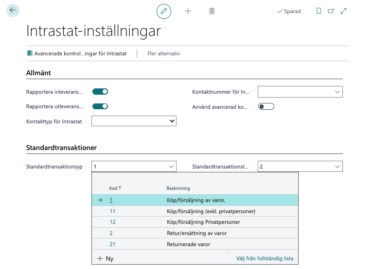 Välj Intrastat-inställningar till vilken Standardtransaktionstyp som önskas vid försäljning/inköp kontra retur.