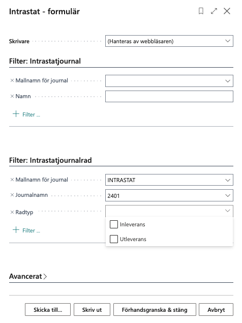 I Intrastatjournaler välj Rapport – Skriv ut Intrastatjournal, välj Radtyp Inleverans eller Utleverans.