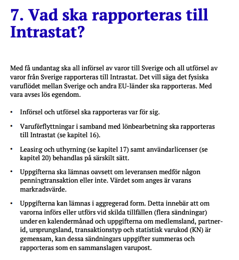 I Intrastat ska leveranser som skett till EU rapporteras oavsett om det är momsfri försäljning eller inte. Tänk på att det gäller också om ni också har varuförflyttningar. För mer detaljerat vad som gäller hänvisar vi till SCB, nedan finner du ett utdrag från “Intrastat - Handledning 2022” samt relevanta länkar.