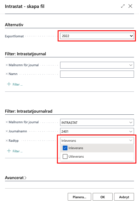 I Intrastatjournal välj Process – Skapa fil och välj vid Radtyp om fil ska skapas för Inleveranser eller Utleveranser. Nytt filformat har tillkommit som har utökats med information om Momsregistreringsnummer och Ursprungsland. För att skicka med nytt filformat behöver du välja Exportformat: 2022. För information hur filen ska lämnas till SCB hänvisar vi till SCBs information.