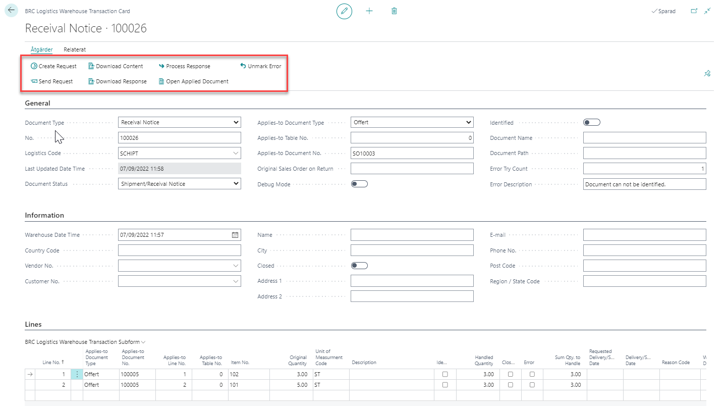 - Process Response används för att manuell processa dokument som kommer bokföra eller uppdatera i BC. Applies-to Document No. visar vilket dokument som kommer uppdateras. Avser data från WMS såsom Shipment Notice, Receival Notice, Item Adjustment etc.