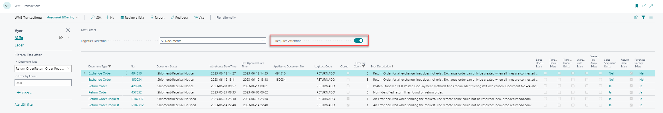 I WMS Transactions visas alla transaktioner till och från systemet. Vanligtvis används denna vy endast för felhantering. Bocka i Requires Attention för att få fram de transaktioner som behöver åtgärdas. Sätt filter på Document Type: Return Order, Return Order Request och Exchange order för enbart se det som avser Return Management-transaktioner.